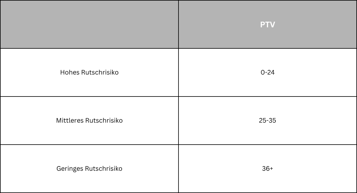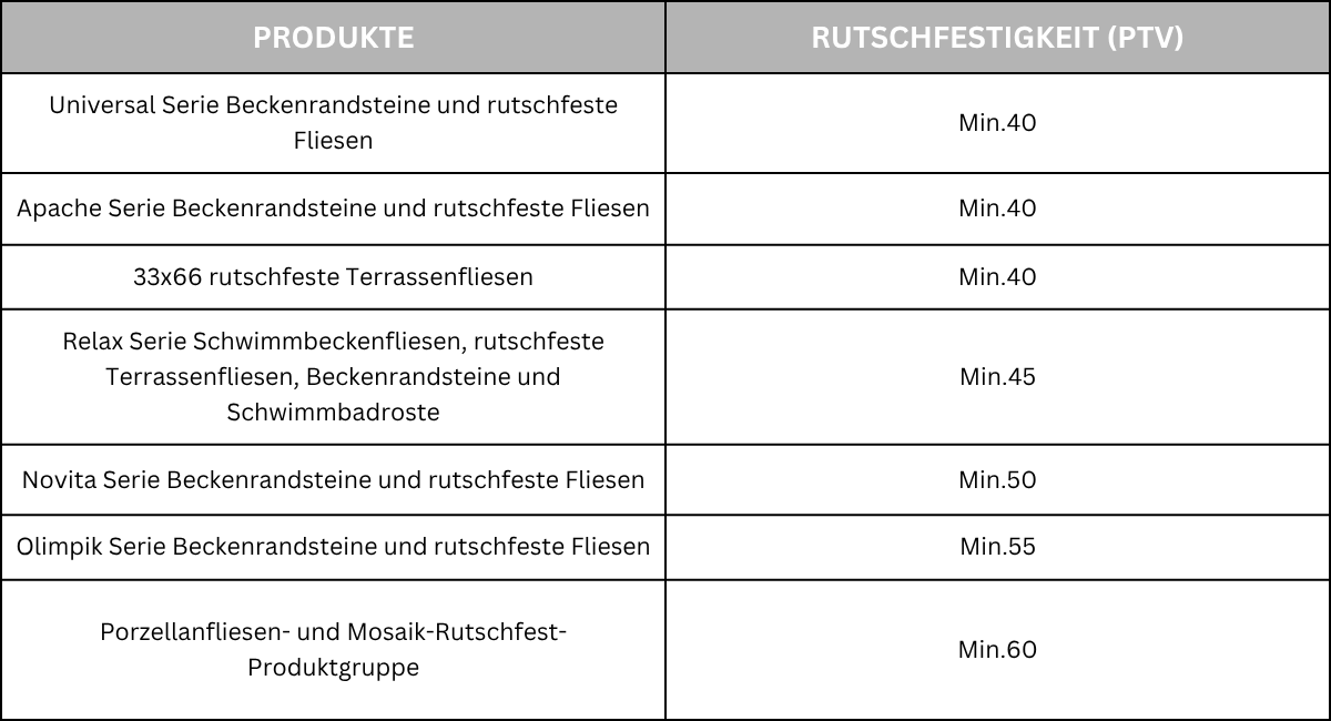 Die PTV (Pendulum Test Value)-Rutschfestigkeitswerte der Serapool Produkte sind wie folgt: