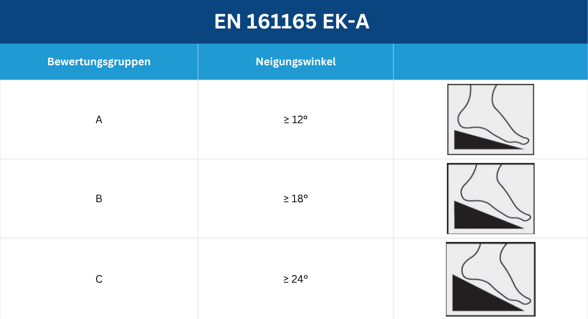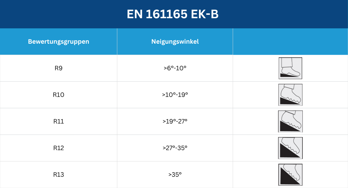 Nach der EN 161165 Anhang-B-Norm bezieht sich der „R-Wert“ in der Regel auf einen Standard, der die Rutschfestigkeit einer Bodenoberfläche misst. Die R-Klassifizierung wird insbesondere bei Bodenbelägen, Gehwegen und industriellen Bereichen verwendet, um die Sicherheit zu gewährleisten. Diese Klassifizierung bewertet den Rutschwiderstand einer Oberfläche und ist entscheidend, um sichere Gehflächen zu schaffen. Die R-Klassen-Werte sind wie folgt: