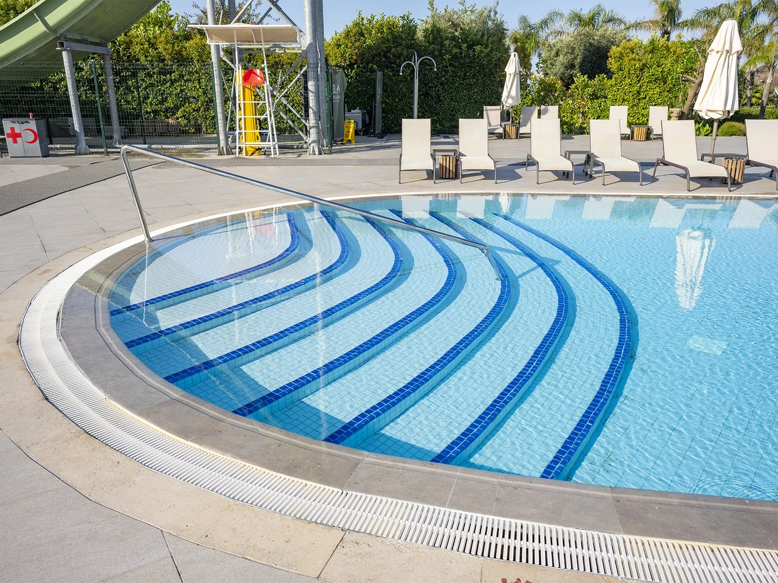 The Ela Excellence Resort Belek Hotel Pool Project offers a refreshing atmosphere with its clear blue tones. The pool floor, clad with Olympic Series Porcelain Tiles, enhances the natural reflection of the water while ensuring long-lasting performance with its Durable structure. Additionally, Fotosera Porcelain Tiles are used to embed the hotel’s logo into the pool, adding an aesthetic detail. With a PTV ≥ 45° Anti-slip value and Low Water Absorption, the project ensures a Safe and Comfortable swimming experience. In the landscape arrangement, Pool Garden Beige Flex gratings and Natural Mocha copings are selected, providing both technical functionality and a harmonious integration with natural tones.