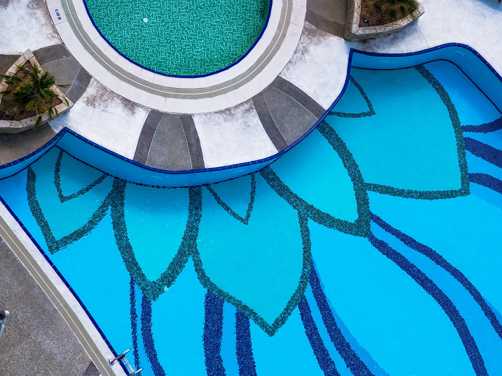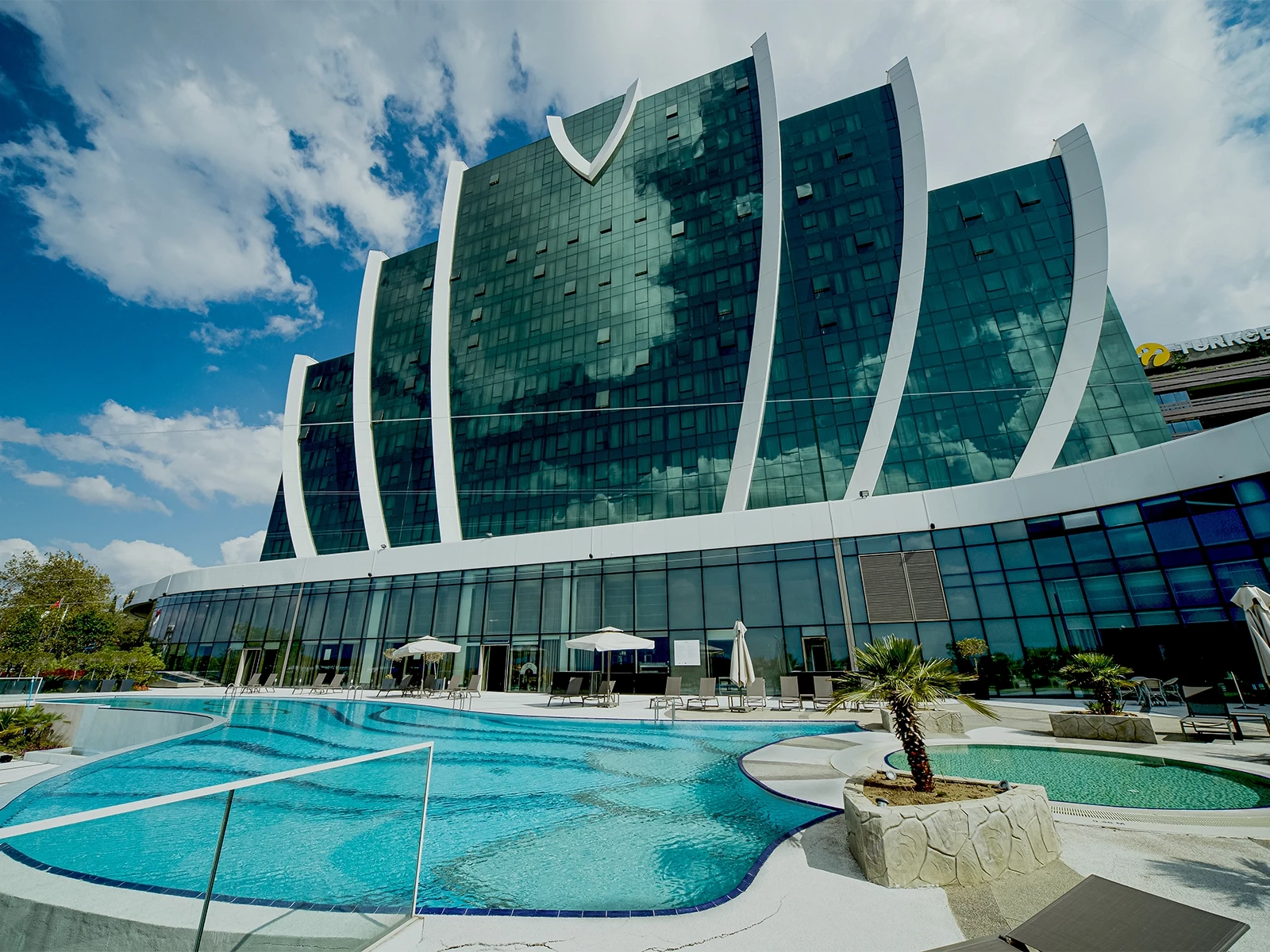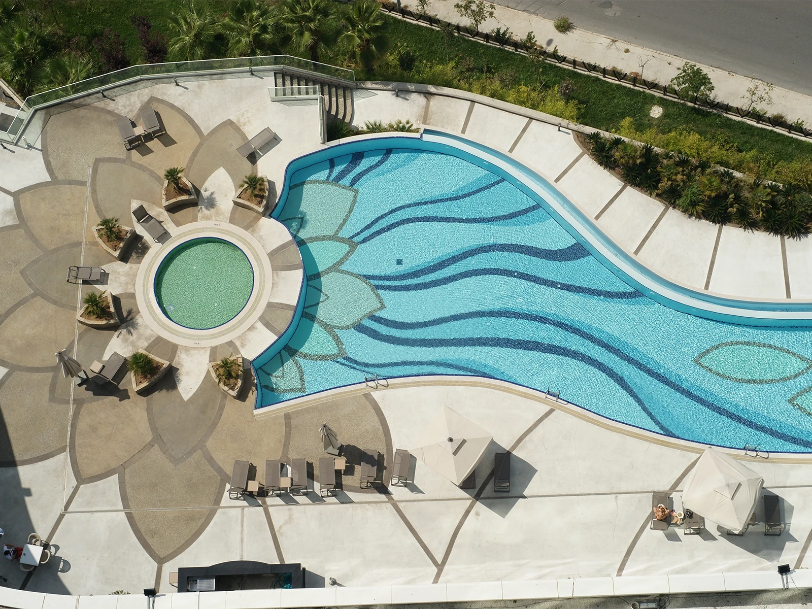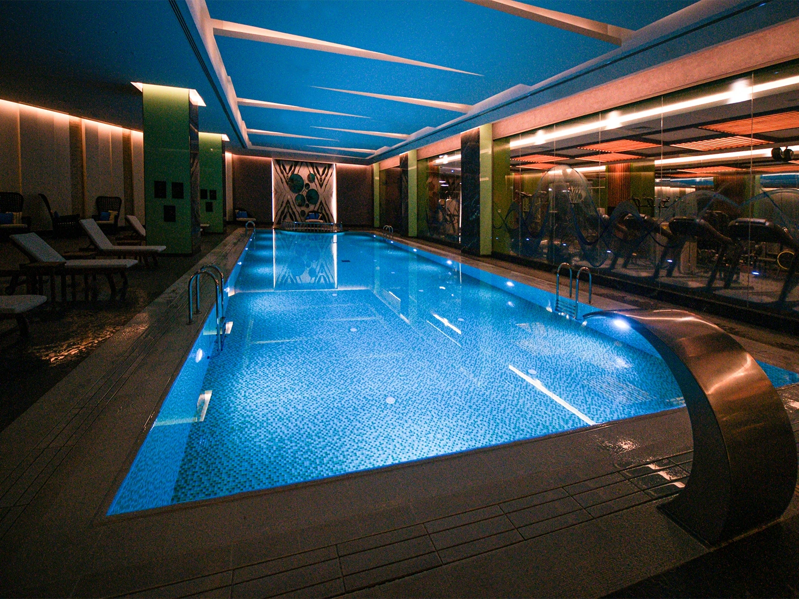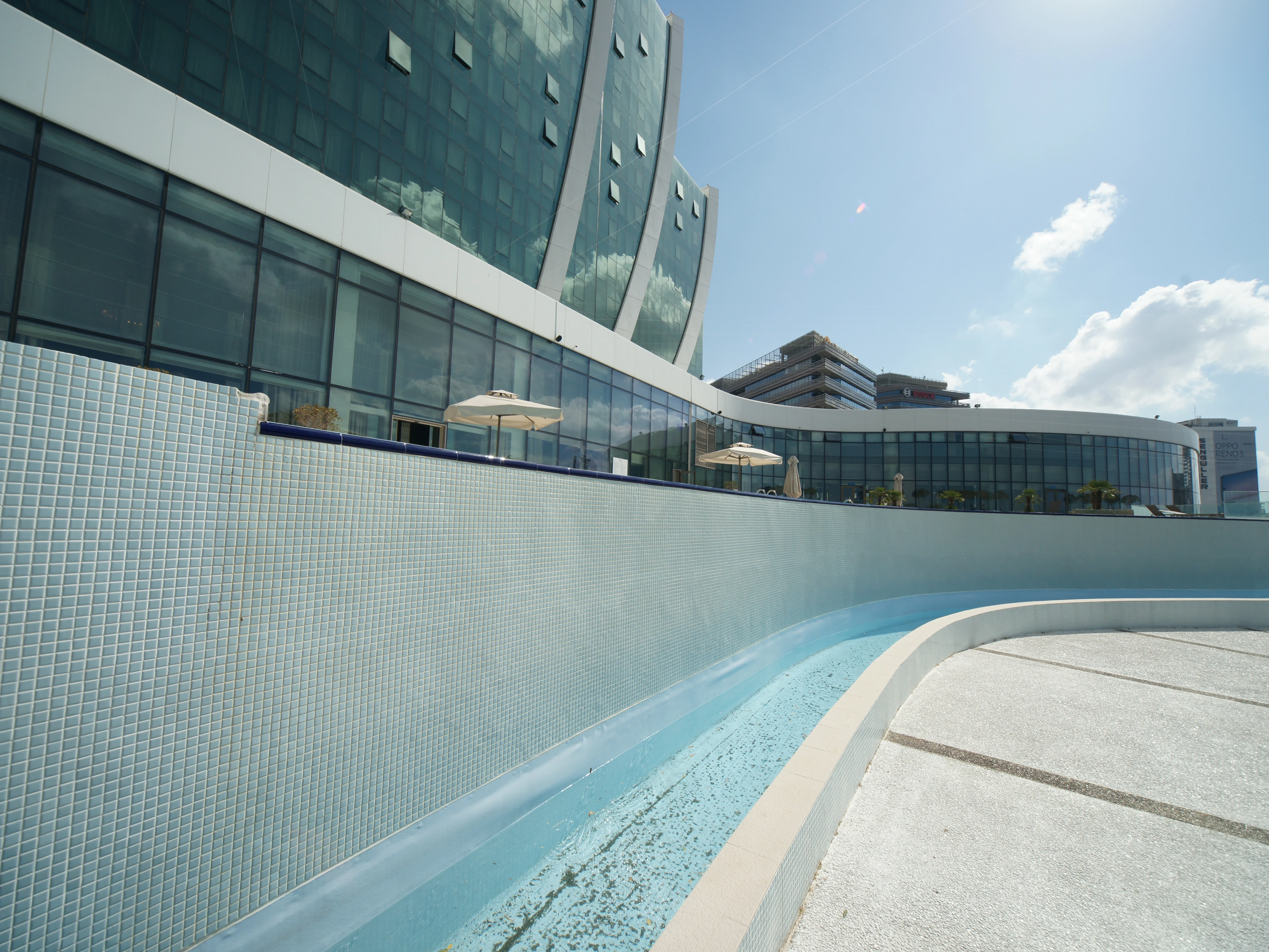 The Elite World Grand Istanbul Küçükyalı Outdoor Pool stands out with its distinctive design and panoramic city view, seamlessly integrated with the hotel’s modern architecture. Wave-like linear patterns emphasize the pool’s dynamic character, while the use of Serapool products ensures both aesthetics and durability. The project incorporates Apache Copings and Apache Series Anti Slip Tile, offering Low Water Absorption and a PTV ≥ 45° Anti-slip value to enhance Safety. At the edges, Porcelain Inner Trim, Outer Trim, and Apache Porcelain Grating support hygiene and functionality around the pool. In addition, Porcelain Pool Mosaics highlight the clarity of the water, enriching the pool’s aesthetic value. Bringing together design and performance, the project offers guests a luxurious urban holiday atmosphere, where Serapool’s advanced technology products combine luxury, Comfort, and Safety in a unique swimming experience.