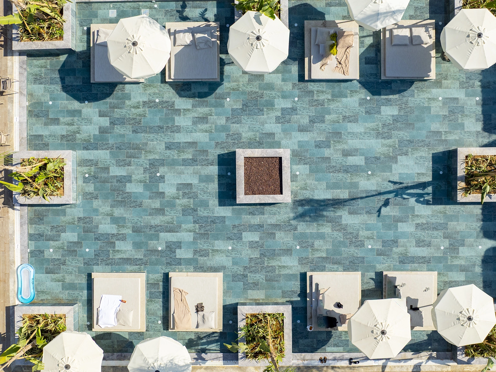 The pool design at SY Hotels Belek was shaped with an approach that blends the soothing tones of nature with modern architecture. On the pool floor, Relax Oasis Green Porcelain Tiles created a refreshing and sophisticated atmosphere, with natural green shades that come alive within the water. Around the pool, Outer Trim details from the Pool Garden Beige series provided functional continuity to the design, while their soft tones complemented the strong color transitions of the Relax Oasis Green series in a balanced way.