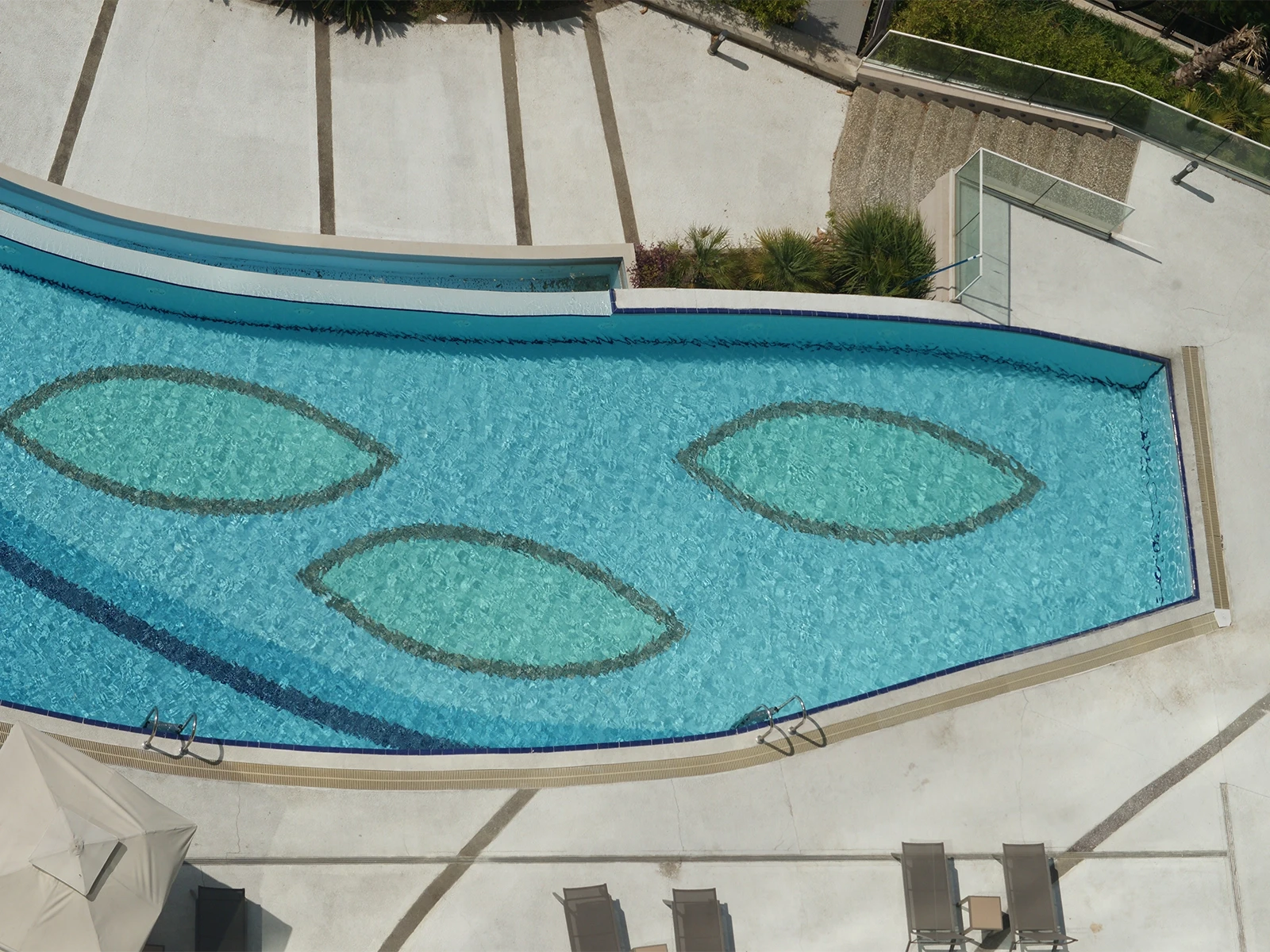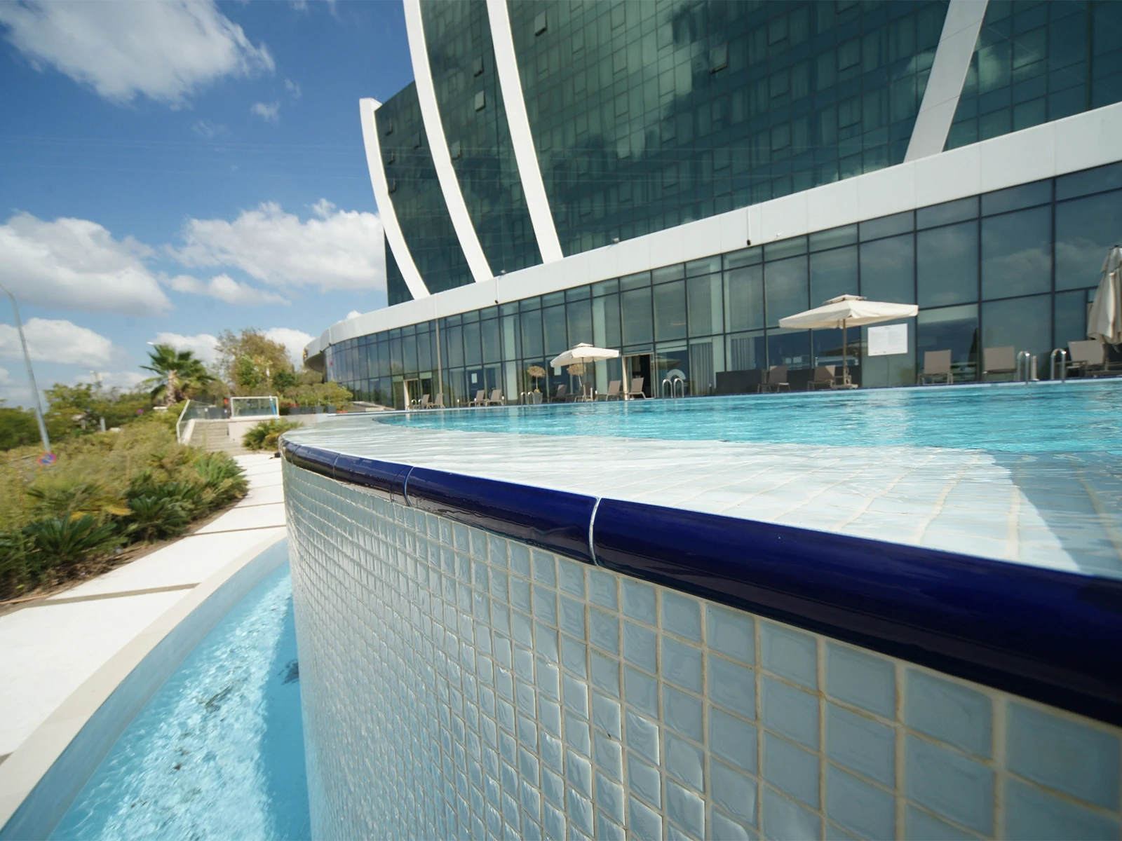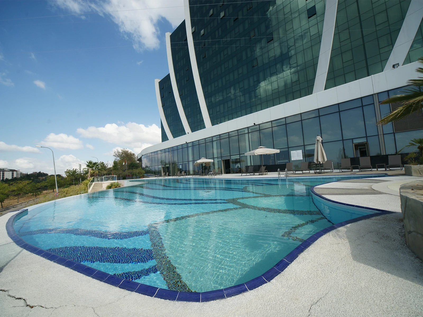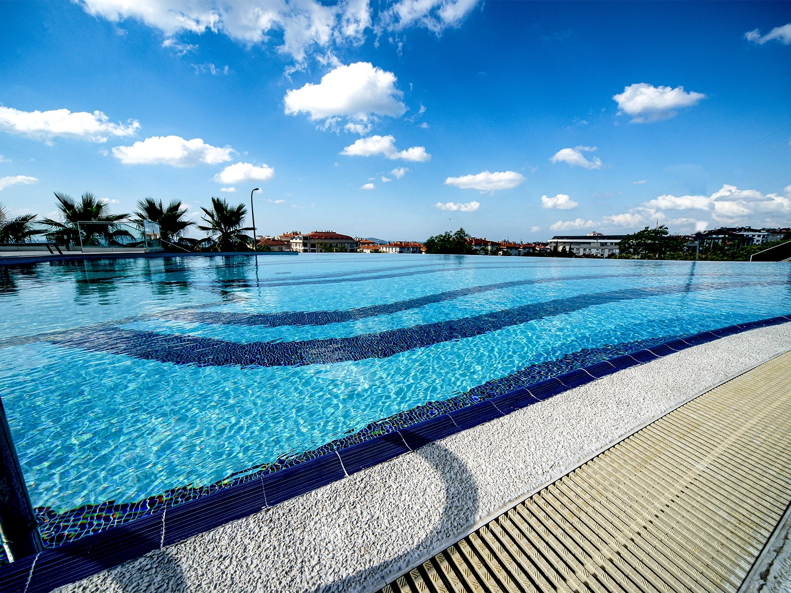 Elite World Grand İstanbul Küçükyalı’nın modern mimarisiyle bütünleşen açık yüzme havuzu özgün tasarımı ve panoramik şehir manzarasıyla öne çıkıyor. Dalga formunu andıran çizgisel desenler havuzun dinamik karakterini güçlendirirken, kullanılan Serapool ürünleriyle hem estetik hem de dayanıklılık sağlanıyor. Projede tercih edilen Apache Havuz Tutamağı ve Apache Seri Kaymaz Karo, düşük su emme oranı ve PTV ≥ 45° kaymazlık değeri ile güvenliği artırıyor. Kenar bitişlerinde kullanılan Porselen İçbükey ve Dışbükey Parçalar ile Apache Porselen Izgara, havuz çevresinde hijyen ve fonksiyonelliği destekliyor. Ayrıca Porselen Havuz Mozaikleri suyun berraklığını vurgulayarak havuz estetiğine katkı sağlıyor. Tasarım ve performansın buluştuğu proje konuklarına şehirde lüks bir tatil atmosferi sunarken Serapool’un ileri teknoloji ürünleri sayesinde lüks, konfor ve güvenliğin bir arada olduğu bir yüzme deneyimi yaşatıyor.