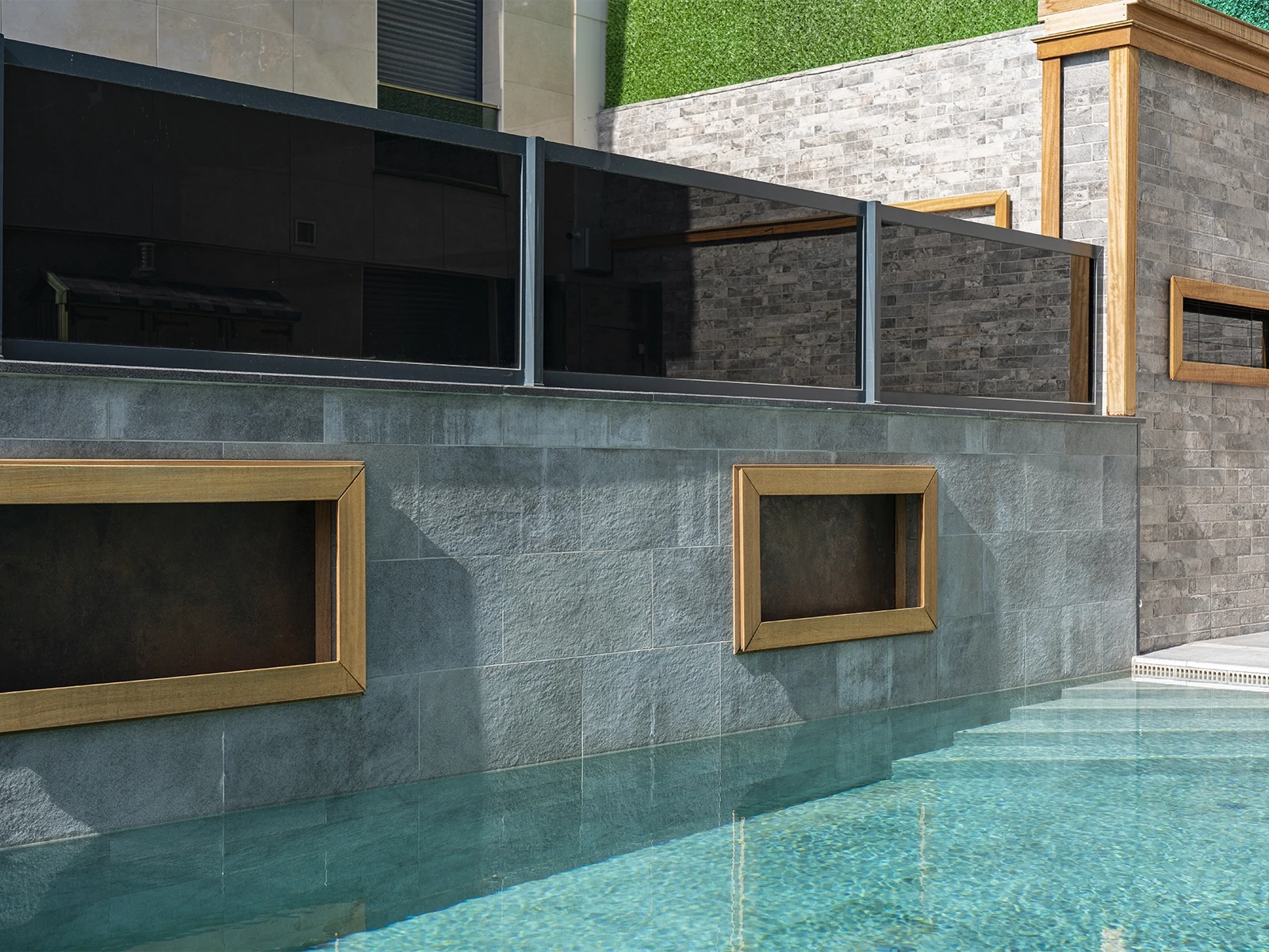 Antique Grey İstanbul Villa Havuzu Projesi estetik ile tekniğin buluştuğu özel bir uygulama olarak öne çıkıyor. Projede kullanılan ürünler yalnızca şıklık değil aynı zamanda güvenlik, dayanıklılık ve fonksiyonelliği de bir arada sunuyor. Pool Garden Grey Flat Tutamak havuz kenarlarında yalın formuyla modern bir görünüm sağlıyor. Teras karolarıyla aynı seviyede uygulanarak kesintisiz bir geçiş oluşturuyor. Pahlı ön kısmı sayesinde çarpma riskini azaltırken kaymaz yüzeyiyle güvenli yürüyüş imkanı sunuyor. Gözeneksiz yapısı sayesinde su emmiyor; don koşullarında çatlama yaşamıyor ve kimyasallara karşı yüksek direnç gösteriyor. Yağmur suyu tahliye sisteminde kullanılan Pool Garden Grey Yağmur Kanalı, yüksek drenaj kapasitesiyle suyun kontrollü şekilde uzaklaştırılmasını sağlıyor. Böylece hem zemin güvenliği korunuyor hem de havuz suyunun kimyasal dengesi bozulmadan bakımı kolaylaşıyor. Delikli versiyonu suyun anında tahliyesini sağlayarak yağmur sonrası oluşabilecek riskleri ortadan kaldırıyor. Sistemi tamamlayan Pool Garden Grey yağmur kanalı köşe ve bitiş parçaları, kanal hattını estetik bir şekilde tamamlıyor. Projede kullanılan tüm ürünler UV ışınlarına, sıcaklık değişimlerine ve kimyasallara karşı yüksek dayanıklılık sergiliyor. PTV ≥ 45° kaymazlık değeri sayesinde ıslak zeminlerde güvenli kullanım sunuyor.